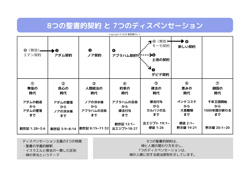 以下は、8つの聖書的契約と7つのディスペンセーションの関係が一目で分かるチャートです。まだダウンロードや印刷をしていない方は、この機会にどうぞ。